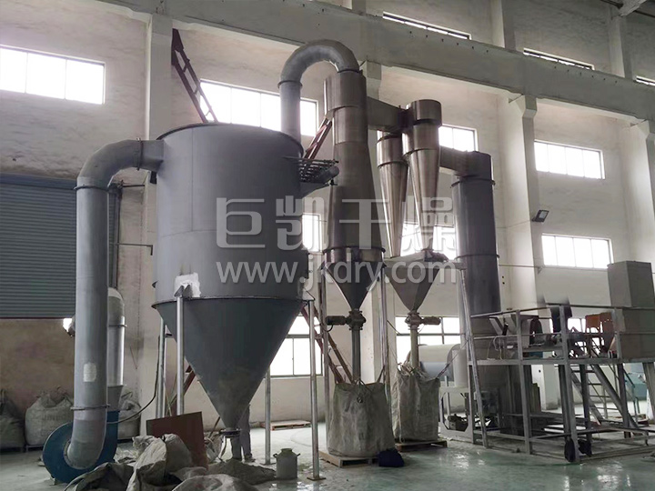 热空气切线进入干燥器底部,在搅拌器带动下形成强有力的旋转风场。膏状物料由螺旋加料器进入干燥器内,在高速旋转搅拌桨的强烈作用下,物料受撞击、磨擦及剪切力的作用下得到分散,块状物料迅速粉碎,与热空气充分接触、受热、干燥。脱水后的干物料随热气流上升,分级环将大颗粒截留,小颗粒从环中心排出干燥器外,由旋风分离器和除尘器回收,未干透或大块物料受离心力作用甩向器壁,重新落到底部被粉碎干燥。
